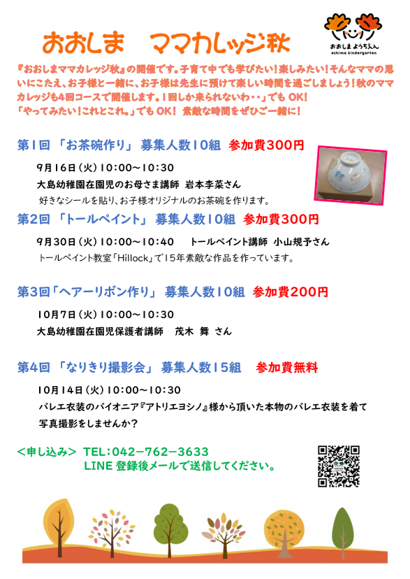 お知らせ カテゴリー別 在園児向け 未就園児向け イベント その他 おおしま ママカレッジ 秋 2025.09.09 未就園児向け 大島幼稚園「ママカレッジ 秋」を開催します! ご予約はLINEでもお電話でも大丈夫です。 是非お気軽にご参加ください! 電話042-762-3633 前へ 次へ 一覧へ戻る