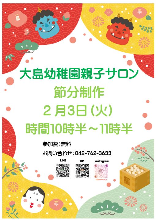 お知らせ カテゴリー別 在園児向け 未就園児向け イベント その他 親子サロン 節分制作 2026.01.16 未就園児向け 2月3日(火)の親子サロンでは節分制作をします! 予約の必要はありません。お気軽にお越しください。 親子サロンは通常通り10時からです。 お問い合わせ:042-762-3633 前へ 次へ 一覧へ戻る